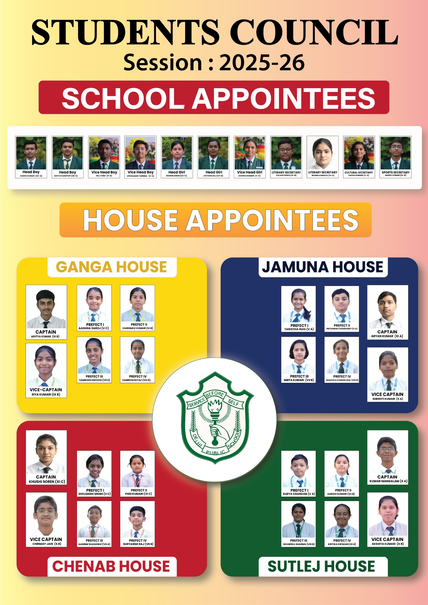 The school is divided into four houses - Ganga, Jamuna, Chenab and Sutlej.